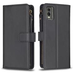 Capa para Nokia C32 com alça de pulso, 9 compartimentos para cartão, 1 carteira de couro com zíper, função de suporte, fecho magnético, capa para celular compatível com Nokia C32 de 6,5 polegadas