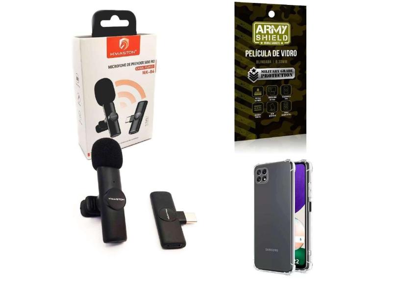 O menor preço encontrado no Brasil para Capa Samsung A22 5G + Microfone Lapela Sem Fio + Película 3D atualmente é R$ 120,37.