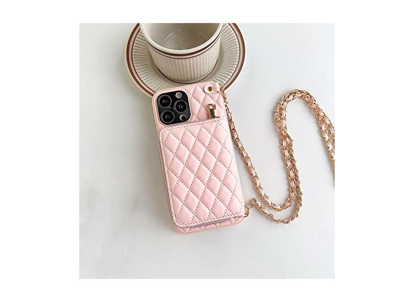 Capa tipo carteira transversal para iPhone 14 13 12 11 Pro Max Slot para cartão Corrente Alça com zíper Bolsa com zíper Capa de couro, rosa, para iPhone 13