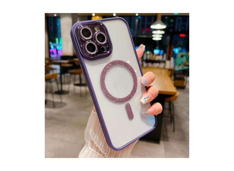 Capa transparente de carga sem fio com glitter para iPhone 14 13 12 11 Pro Max 14 Plus Capa magnética de luxo, roxo escuro, para iPhone 13Pro