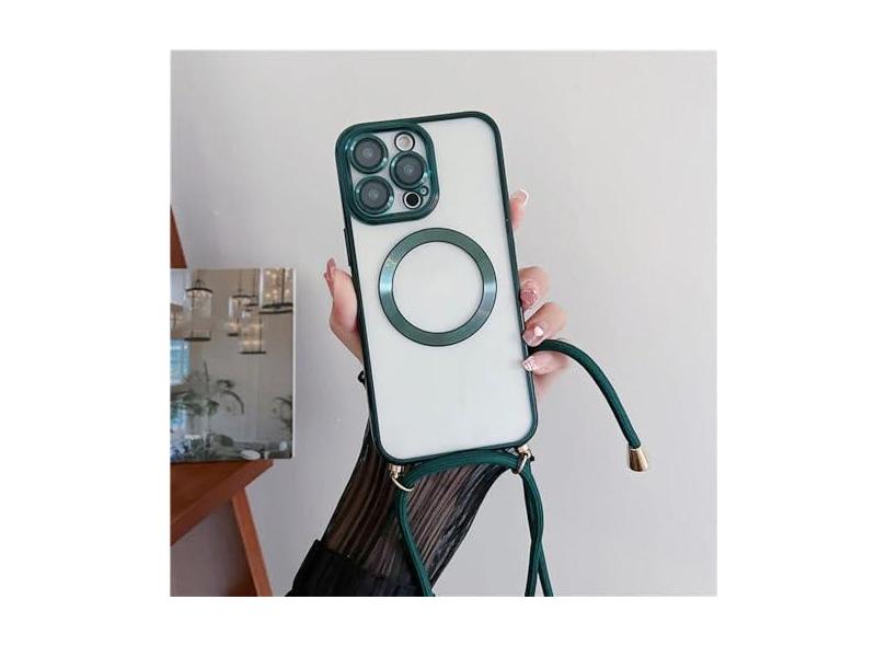Capas de carregamento magnético sem fio transparentes revestidas para iPhone 15 14 11 12 13 Pro Max Crossbody Lanyard Colar Capa, verde escuro, para iPhone 14 Pro