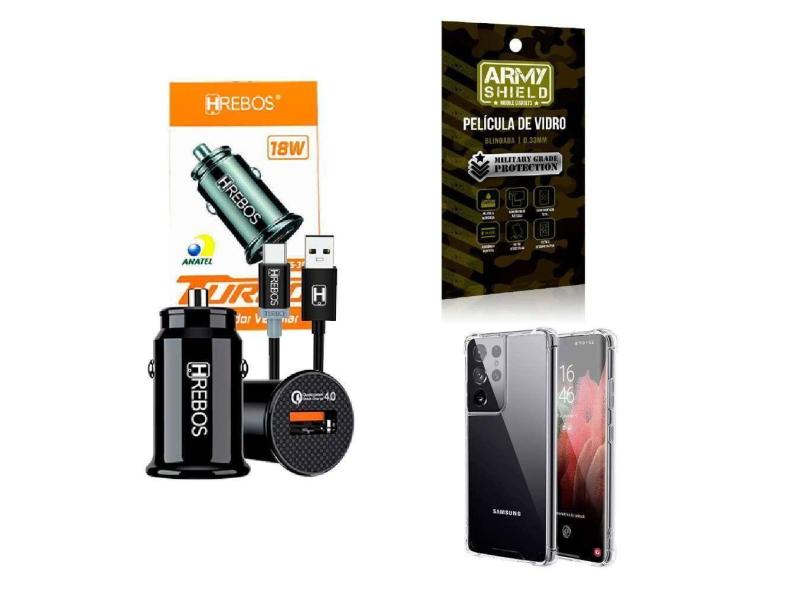 Carregador Veicular + Capinha Samsung S21Ultra + Película 3D