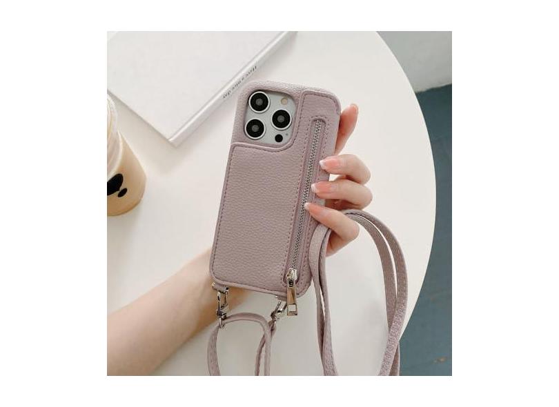 Carteira com zíper espelho de maquiagem capa de telefone com cordão crossbody para iPhone 14 Pro Max 13 12 11 XR XS 7 8 Plus capa de couro com bolso para cartão, roxo claro, para iPhone 12 Mini