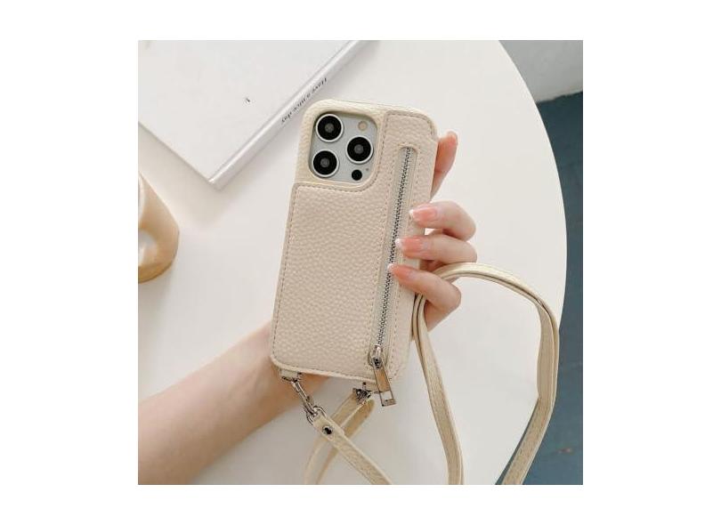Carteira com zíper espelho de maquiagem crossbody cordão capa de telefone para iPhone 14 Pro Max 13 12 11 XR XS 7 8 Plus capa de couro com bolso para cartão, bege, para iPhone 13
