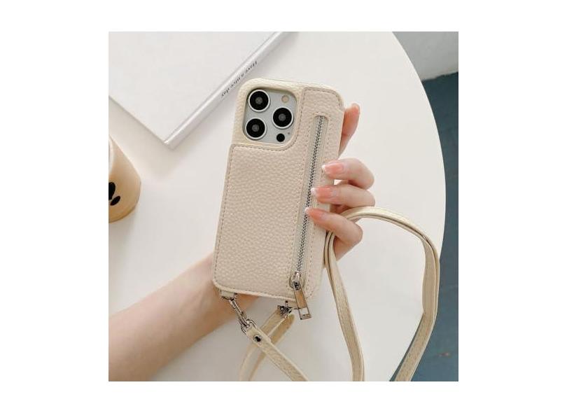 Carteira com zíper espelho de maquiagem crossbody cordão capa de telefone para iPhone 14 Pro Max 13 12 11 XR XS 7 8 Plus capa de couro com bolso para cartão, bege, para iPhone14 Pro