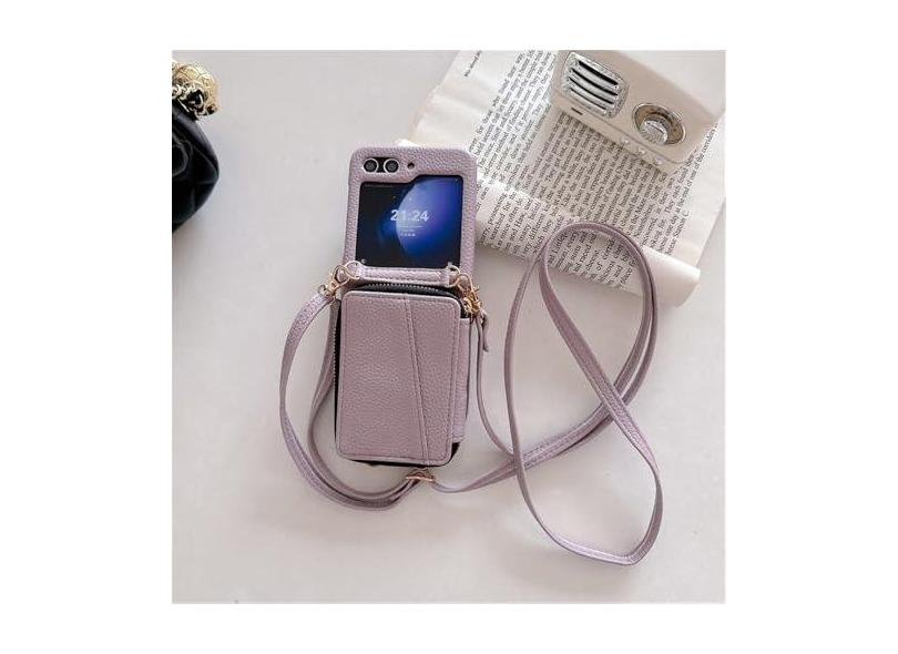 Carteira crossbody com zíper e porta-cartão capa de telefone para Samsung Galaxy Z Flip 6 5 4 3 Flip6 Flip5 Flip4 Flip3 5G capa de couro, roxa, para Galaxy Z Flip6