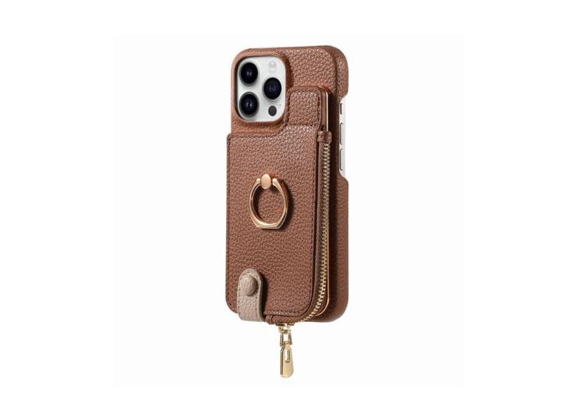 Carteira de couro com zíper com porta-cartão capa de telefone para iPhone 13 12 Mini 15 14 11 Pro Max XS XR X 7 8 Plus Ring Kickstand Cover, marrom, para iPhone Xs Max