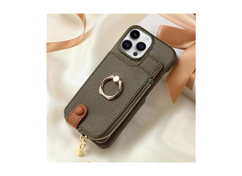 Carteira de couro com zíper e porta-cartões capa de telefone para iPhone 13 12 Mini 15 14 11 Pro Max XS XR X 7 8 Plus Capa com suporte de anel, verde militar, para iPhone 14 Pro