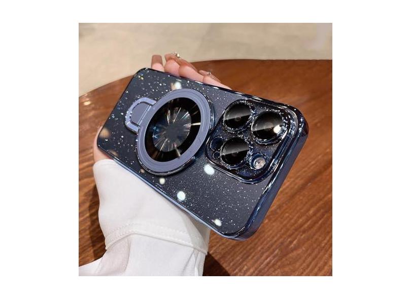 Caso de carregamento sem fio de luxo para iphone 11 12 13 14 15 pro max plus glitter anel magnético suporte capa transparente, céu azul, para iphone 15