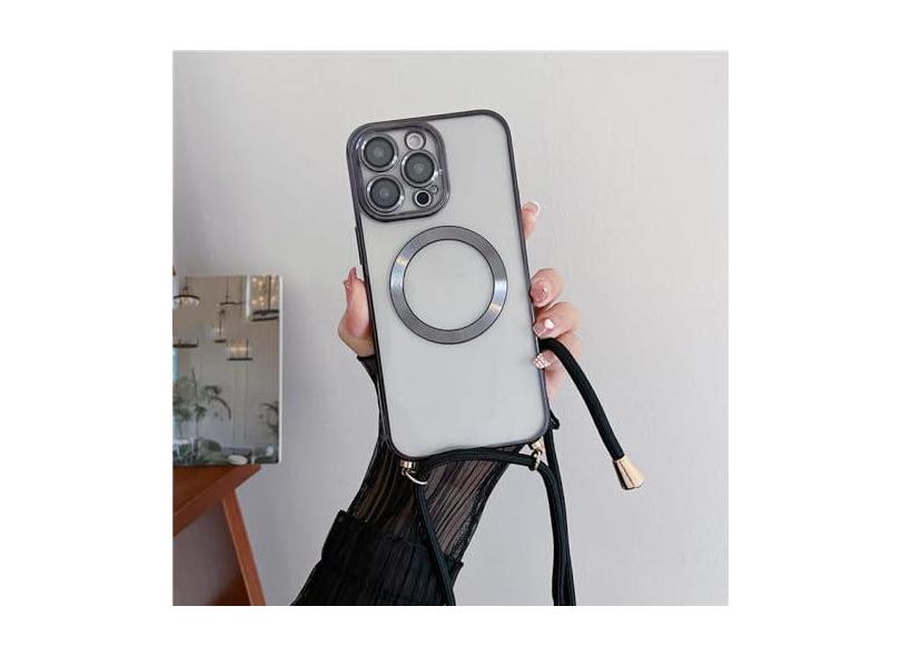 Chapeamento claro magnético sem fio casos de carregamento para iphone 15 14 11 12 13 pro max crossbody cordão colar capa, preto, para iphone 14 plus