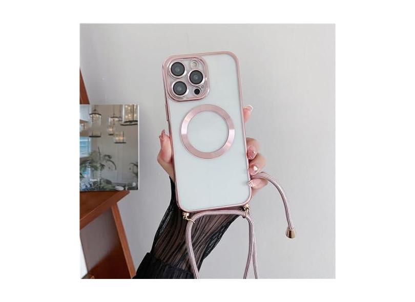 Chapeamento claro magnético sem fio casos de carregamento para iphone 15 14 11 12 13 pro max crossbody cordão colar capa, rosa, para iphone 14 promax