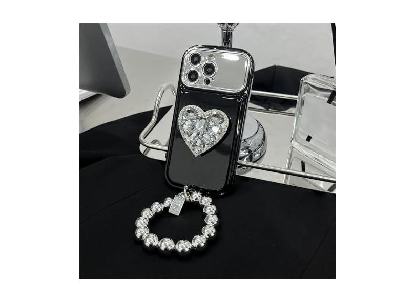Chapeamento pendurado pulseira redonda capa de telefone com janela grande para iPhone 13 Pro Max 14 Plus 12 11 capa de suporte de espelho de coração de diamante, preta, para iPhone 11