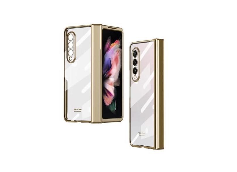 Com suporte para caneta para Samsung Galaxy Z Fold 5 4 3 2 Case Dobradiça Transparente Chapeamento Transparente Capa Protetora de Tela Cheia, Dourada, para Galaxy Z Fold 3