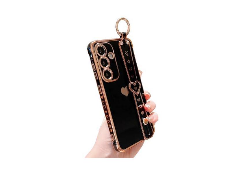 DEFBSC Capa compatível com Samsung Galaxy S24 Plus, capa de coração de amor com borda galvanizada com alça de pulso, proteção total da câmera cantos reforçados à prova de choque, capa de TPU macia à