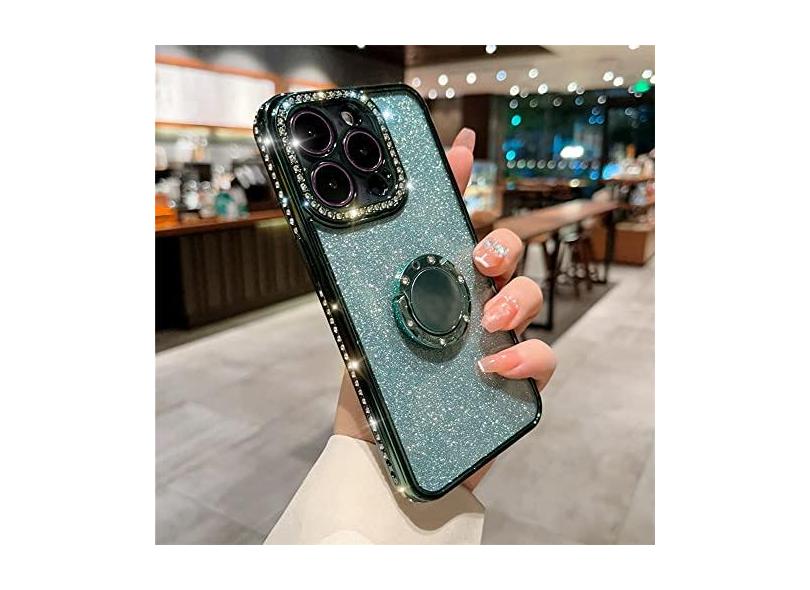 Estojo de suporte de anel de diamante com brilho e strass para iPhone 11 12 13 14 Pro Max XS XR 8 7 Plus SE Capa de silicone macio, verde escuro, para iPhone 13