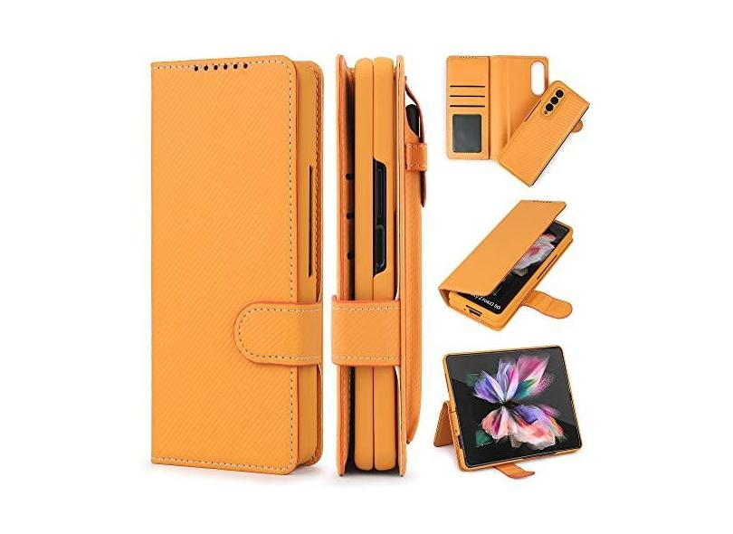 Estojo destacável para Samsung Galaxy Z Fold 3 Fold 4 Moda Couro PU Magnetic Kickstand Cover com S Pen Stylus Holder, Sarja Laranja, para Samsung Z Fold 3