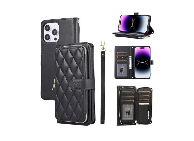 Furiet Capa carteira para iPhone 15 Pro de 6,1 polegadas com alça de pulso destacável, bolsa com zíper com 9 compartimentos para cartões, capa de telefone com suporte de couro PU de luxo para