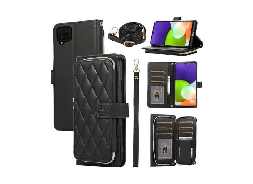 Furiet Capa carteira para Samsung Galaxy A12/M12 com alça de pulso, alça de ombro transversal, 9+ compartimentos para cartões, bolsa com zíper, capa de celular com suporte de couro PU de luxo para A