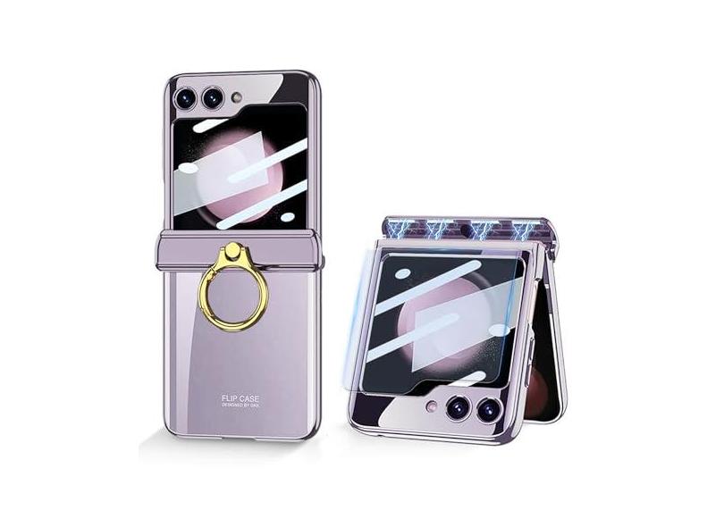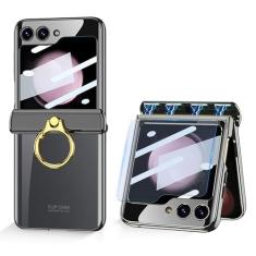 Furwabo Capa transparente para Samsung Galaxy Z Flip 5 com proteção magnética para dobradiça e suporte de anel e protetor de tela externo, capa transparente galvanizada à prova de choque para Samsung