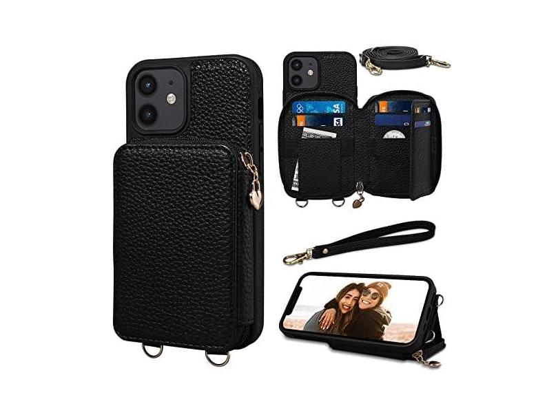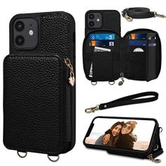 Keallce Capa para iPhone 12/12 Pro, cordão destacável e alça de mão com compartimentos para cartão com bloqueio RFID para iPhone 12, capa de telefone de couro com zíper transversal para iPhone 12 Pro,