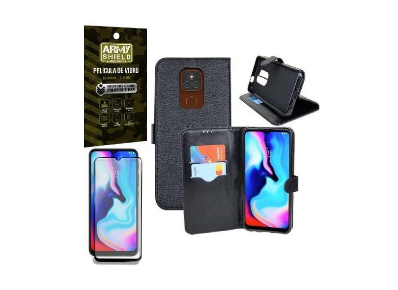 Kit Capa Carteira Moto E7 Plus +Película Vidro 3D Armyshield