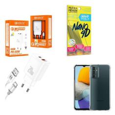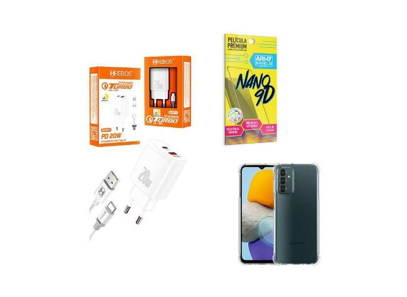O menor preço encontrado no Brasil para Kit Carregador Turbo 20W + Capinha Samsung M23 + Película de Cerâmica atualmente é R$ 77,90.