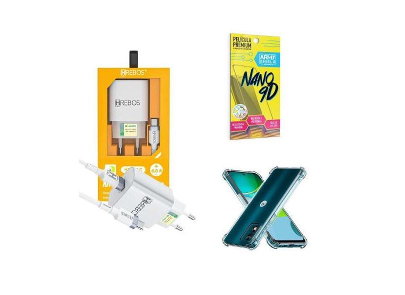Kit Carregador Turbo + Capinha Motorola E13 + Película 9D - Hrebos