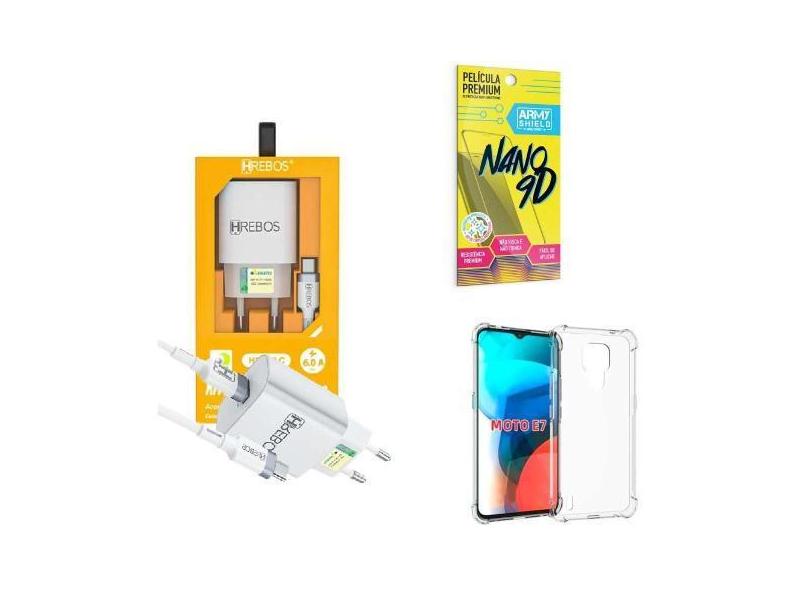 Kit Carregador Turbo + Capinha Motorola E7 + Película 9D - Hrebos