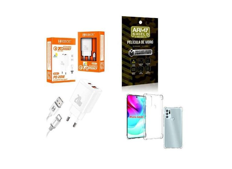Kit Carregador Turbo + Capinha Motorola G60 S + Película 3D - Hrebos
