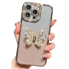 Kwhapoo Capa luxuosa Bling compatível com iPhone 14 Pro de 6,1 polegadas, linda capa de suporte de borboleta de diamante com glitter, capas protetoras de silicone macio à prova de choque para mulheres