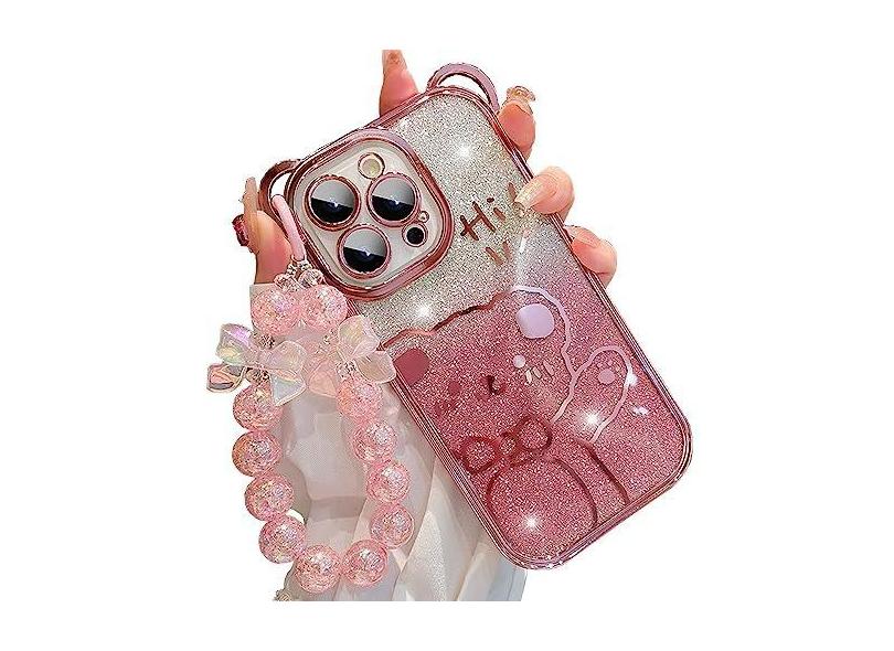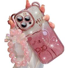 Linda capa para iPhone 15 Pro Max, capa com estampa de urso com corrente de pulso borboleta pérola para mulheres/meninas, presente de papel com glitter removível, TPU macio, à prova de choque para