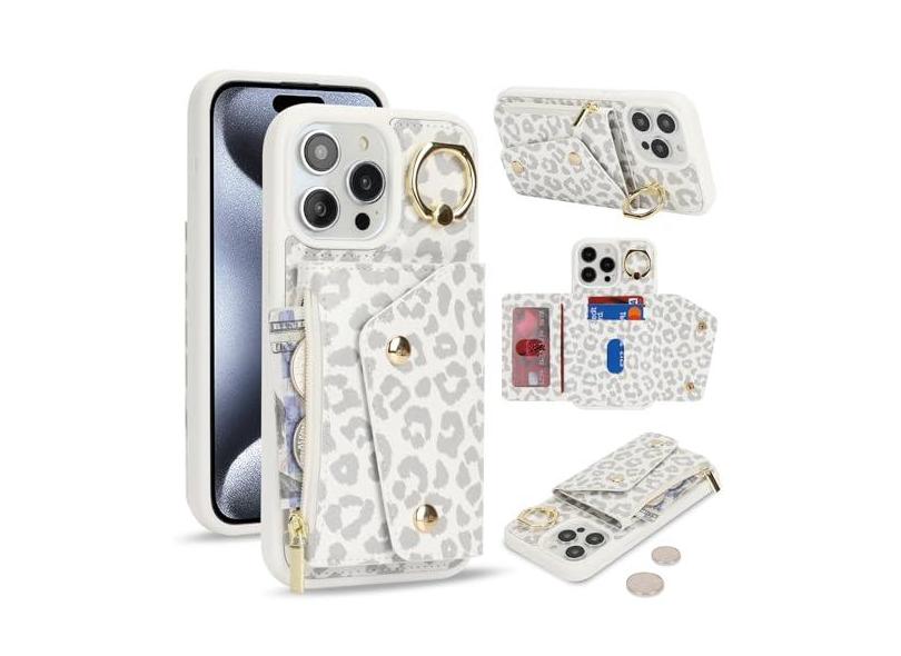 Lipvina Capa para iPhone 14 Plus com porta-cartões - bolso com zíper, suporte para cartão de crédito, bloqueio de RFID, anel de suporte, capa carteira de telefone para mulheres e homens (leopardo