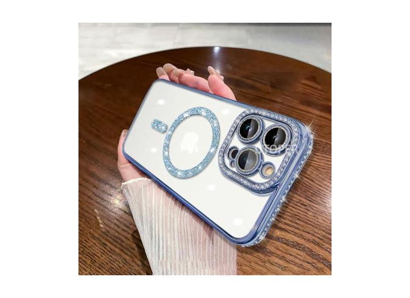 Luxo diamante macio tpu claro brilho caso para iphone 15 11 12 13 14 pro max mais capa de carregamento magnético sem fio, azul, para iphone 14 pro