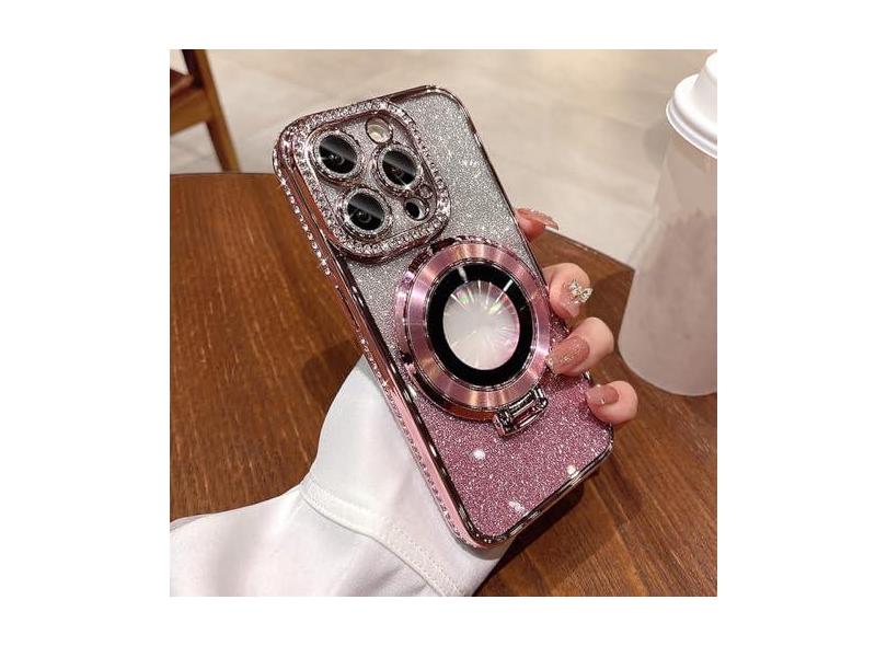 Luxo sem fio de carregamento caso jóias para iphone 11 12 13 14 15 pro max plus glitter anel magnético suporte pára-choques capa, rosa, para iphone 12pro