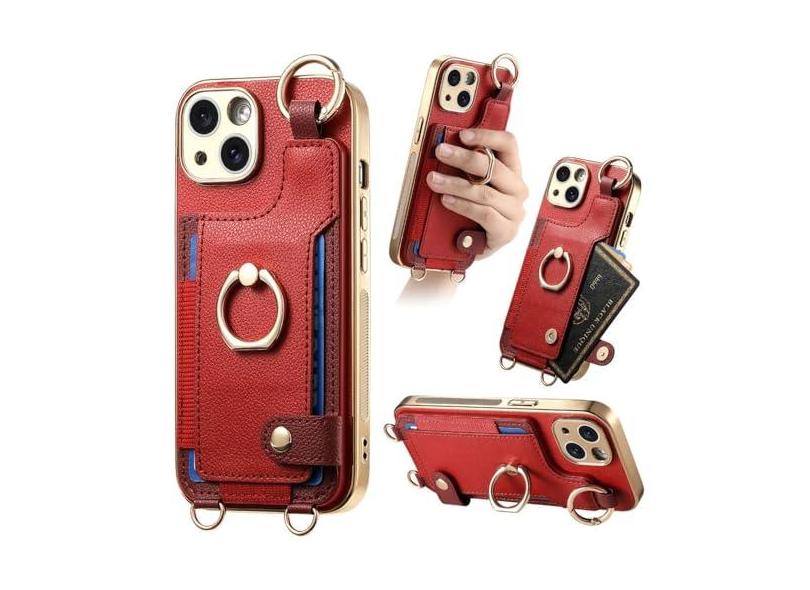 Para iphone 15 14 plus 13 12 11 pro max chapeamento caso do telefone alça de pulso anel com cordão longo & amp; Capa de couro PU com corda de mão curta, vermelha, para iPhone 15 Plus
