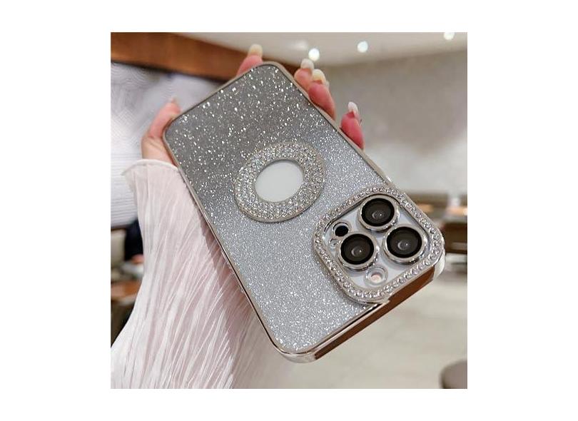 Para iPhone 15 Pro Max Revestimento de luxo Gradual Flash Diamond Frame Capa de telefone para iPhone 11 12 13 14 15 Plus Capa protetora de lente, capa prateada, para iPhone 15