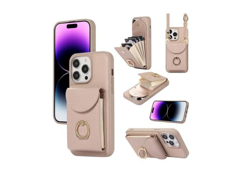 Para iphone14pro 13promax titular do cartão cordão anel suporte cartão moeda bolsa capa de couro, damasco, para iphone 12pro
