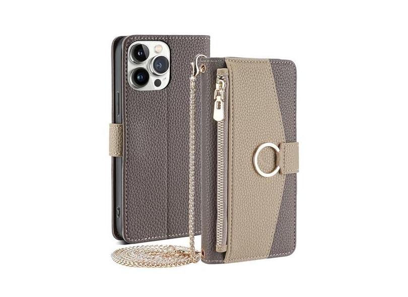 POYUFRG Capa flip para iPhone 16 Pro Max/16 Pro/16 Plus/16 Plus/16, capa de telefone carteira com zíper transversal com compartimentos para cartões espelhados, suporte, capa de couro elegante, cinza,