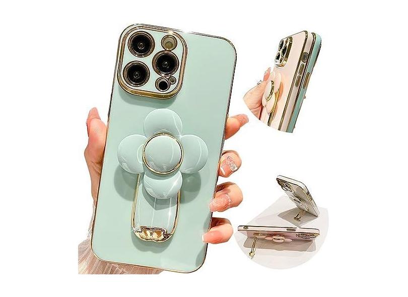 Pretaco Capa para iPhone 15 Pro Max com suporte, [suporte oculto para telefone] [Linda flor Relif Rotativa de 360°] [Linha de borda dourada de luxo] Capa de telefone macia e fina para meninas e