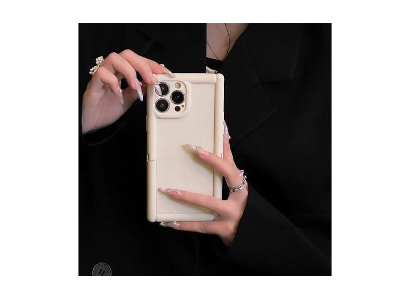 Suporte quadrado de luxo com suporte de cor sólida capa de telefone com sensação de pele para iPhone 11 12 13 14 15 Pro Max capa de acrílico à prova de choque, branca, para iPhone 15 Pro