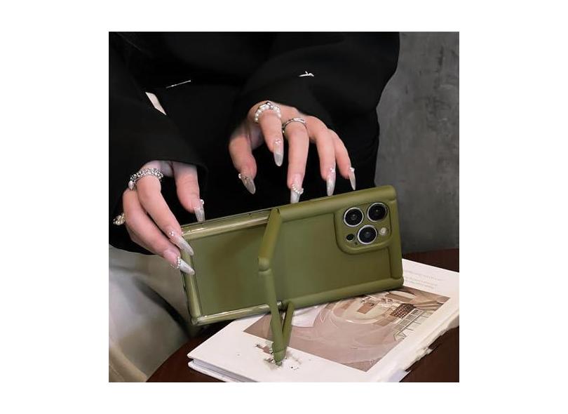 O menor preço encontrado no Brasil para Suporte quadrado de luxo com suporte de cor sólida capa de telefone com sensação de pele para iPhone 11 12 13 14 15 Pro Max capa de pára-choque acrílico à prova de choque, verde, para iPhone 11 atualmente é R$ 111,36.
