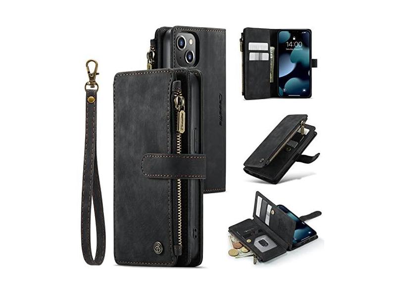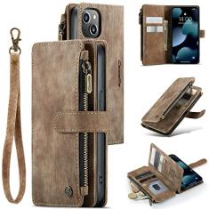 UEEBAI Capa carteira para iPhone 14 Plus de 6,7 polegadas, capa de telefone premium feita à mão de couro PU com compartimentos para cartões, fecho magnético, bolso com zíper, suporte, capa flip com