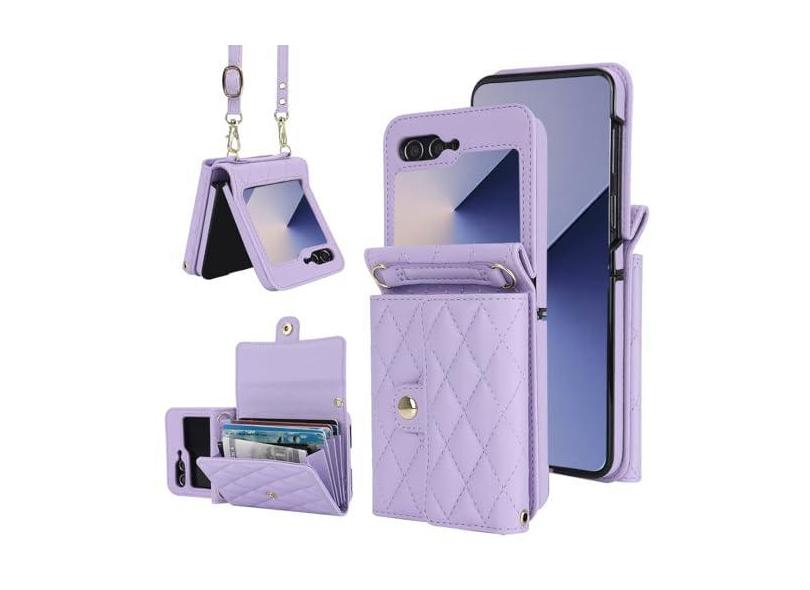XIMAND Capa tipo carteira transversal para Samsung Galaxy Z Flip 6 acordeão, 4 compartimentos para cartão, bloqueio RFID e alça ajustável - Acessório elegante e versátil para a mulher moderna chique