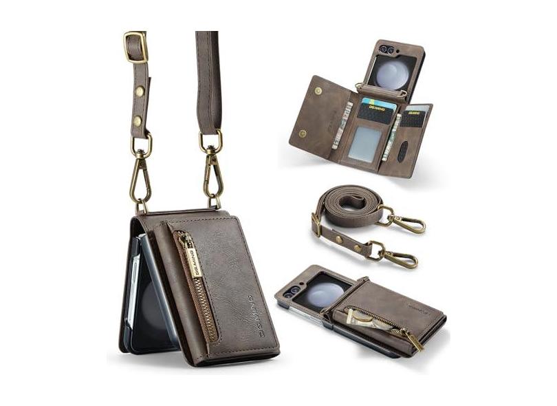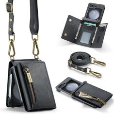 XYAJUANG Capa de telefone compatível com Samsung Galaxy Z Flip 5, design com zíper atualizado, capa de celular dobrável de couro PU com alça de ombro e suporte para cartão, capas de telefone com bolso