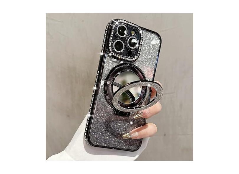 ZXDK Capa de diamante com glitter com suporte espelhado para iPhone 15 14 13 12 Pro Max, suporte magnético, protetor de lente de câmera compatível com Magsafe, capa Rhinesetone Bing (preta, para