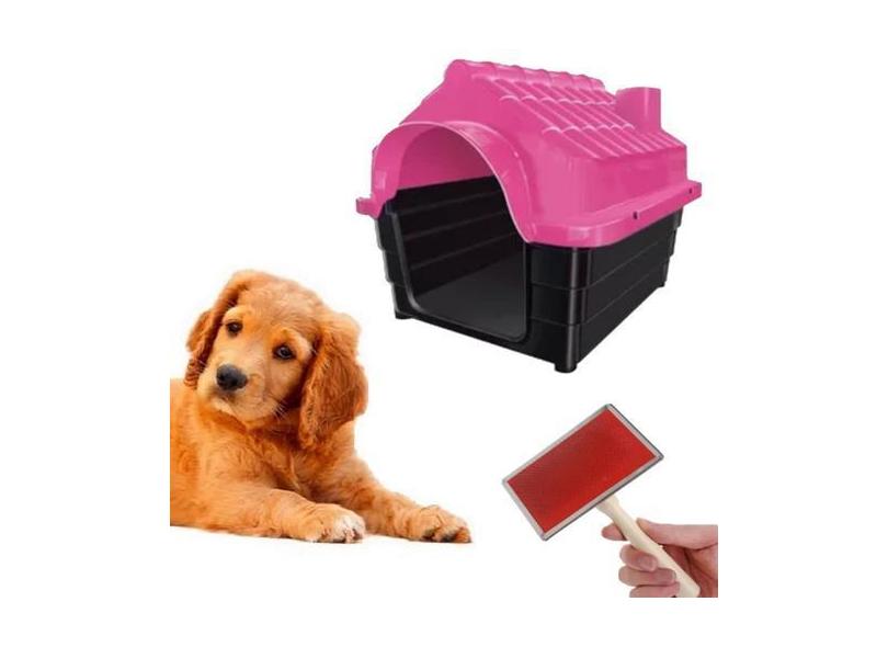 Casa Para Cachorro Porte N3 Rosa + Rasqueadeira Cabo Madeira - Mecpet