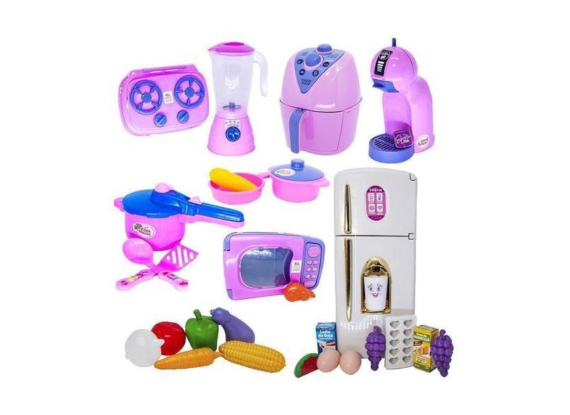 O menor preço encontrado no Brasil para Kit Cozinha Infantil Geladeira Menina Rosa Microondas 29Pç - Altimar atualmente é R$ 299,16.