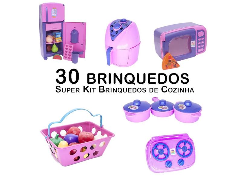 O menor preço encontrado no Brasil para Kit Cozinha Infantil Geladeira Microondas Mercado Fogão 30pç atualmente é R$ 184,81.