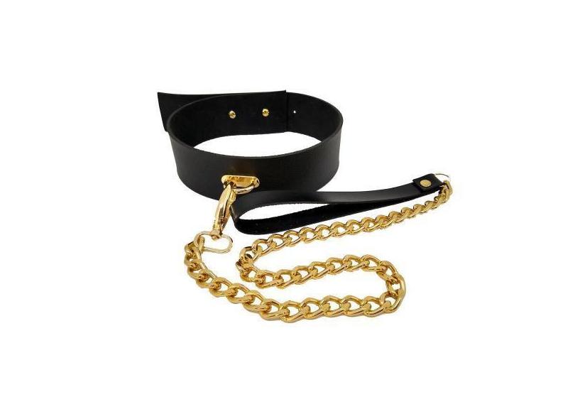 Coleira Com Corrente Dourada E Guia - Preto Com Dourado - Sensual Sexs