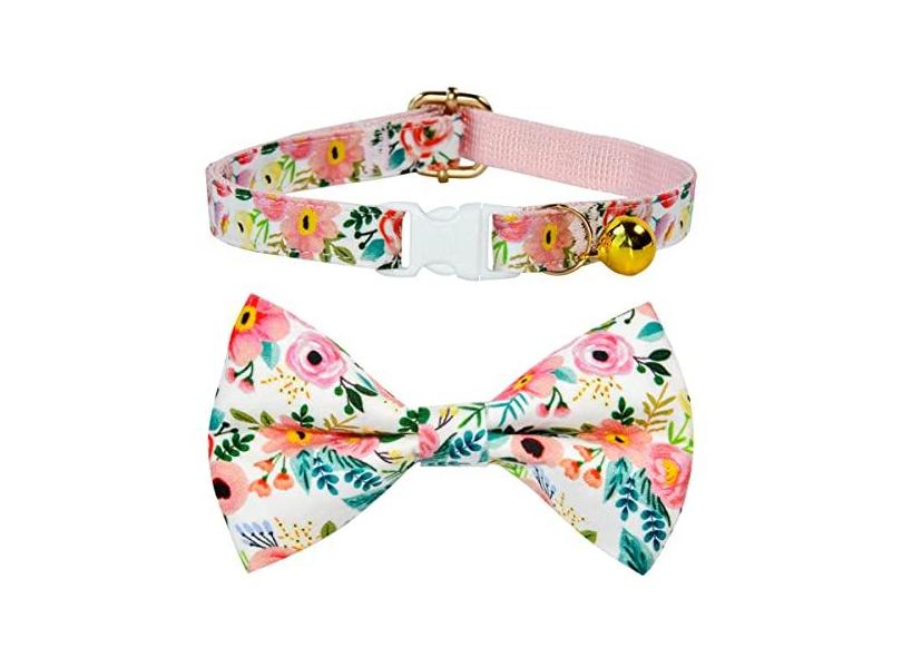 Coleira de gravata borboleta de gato com sino, estampa de flor – fundo branco, gola com fivela de plástico de segurança para gatos